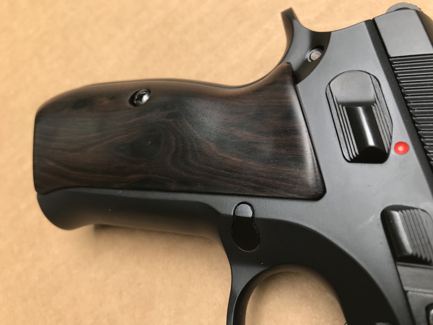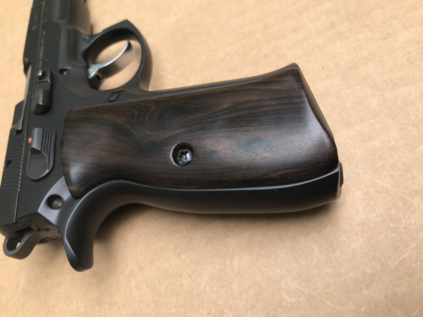 A set of smooth Macassar ebony grips for the CZ-75 series (including 75B, 85B, and SP-01). These are finished with paste wax only -- the wood is naturally polished to a high sheen and is so dense it is practically waterproof, so it does not require a built-up layer of finish.